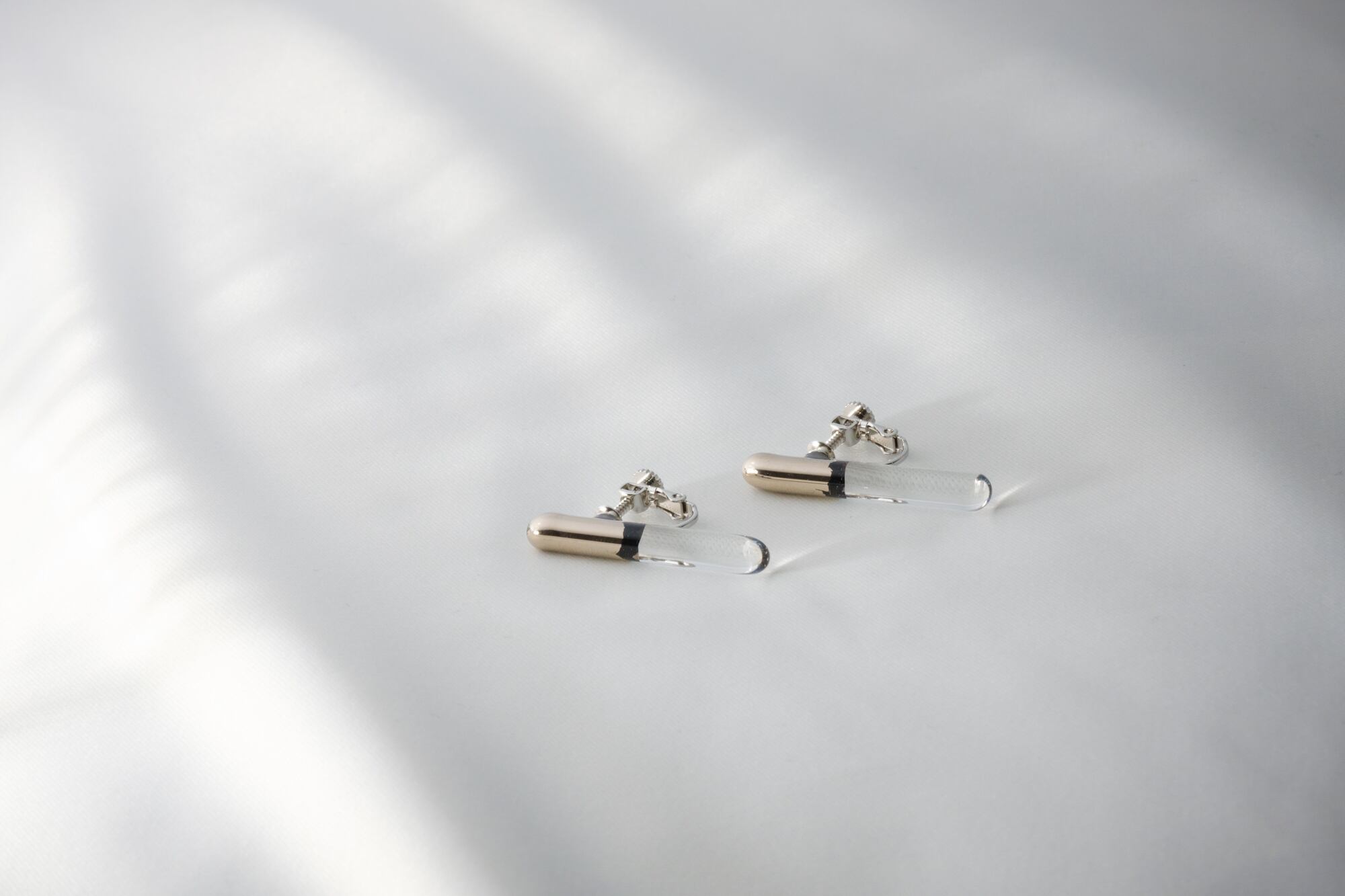 透明でまっすぐなガラスにランダムなプラチナ彩を施したピアス/イヤリングです。